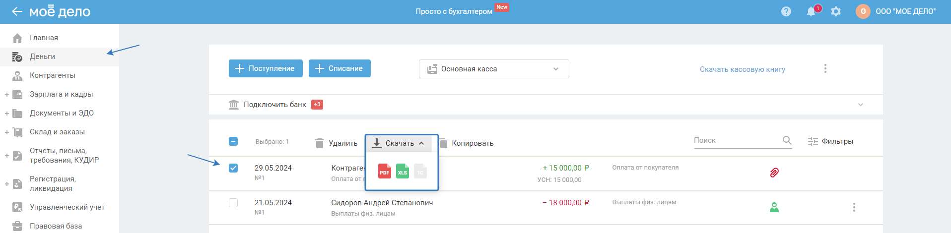 Чтобы скачать приходный кассовый ордер (ПКО) или расходный кассовый ордер (РКО), в разделе «Деньги — Касса» выберите операцию галочкой. Строка над таблицей операций станет активна. Нажмите на кнопку «Скачать» и выберите удобный формат PDF или XLS.