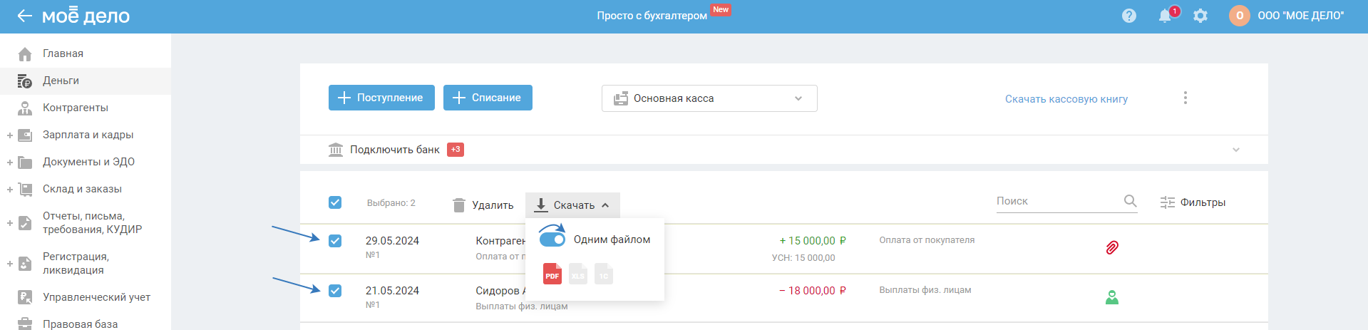 Для того чтобы скачать приходные кассовые ордера (ПКО) или расходные кассовые ордера (РКО) одним файлом, выделите их в таблице в разделе «Деньги» — «Касса», нажмите на кнопку «Скачать» и включите тумблер «Одним файлом», после чего выберите формат (в таком случае доступен только формат PDF):