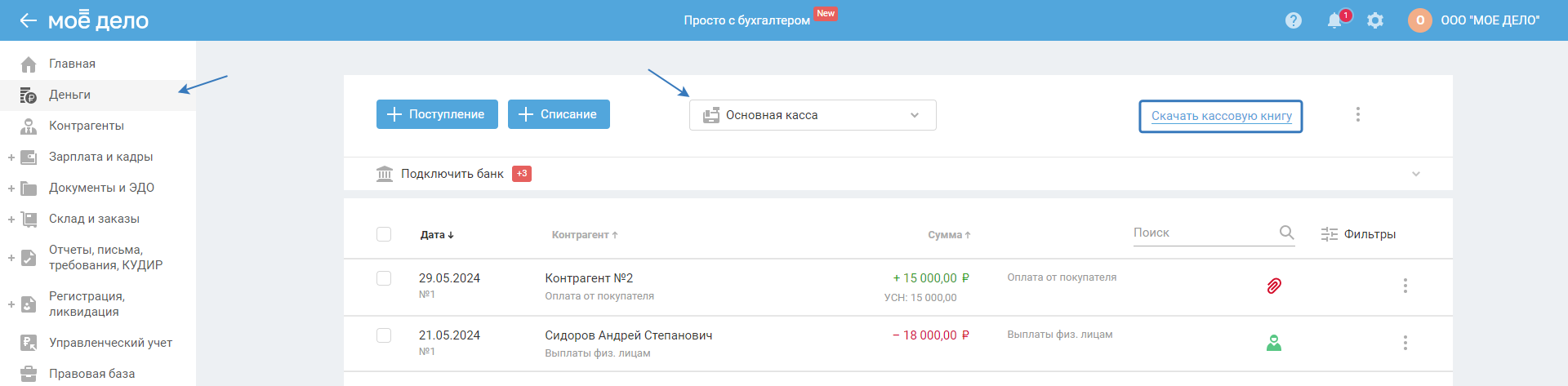 Добавить наличные операции, скачать кассовые ордера и кассовую книгу можно в разделе «Деньги — Касса». Если у вас несколько кассовых аппаратов, то в разделе «Деньги» — «Касса» вы сможете отслеживать операции по каждому ККТ. Отдельно по каждой точке вы сможете скачивать кассовые документы (кассовую книгу, кассовые ордера).