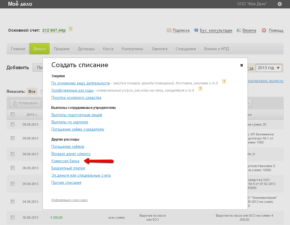 В окне «Создать списание» выберите тип списания «Комиссия банка».