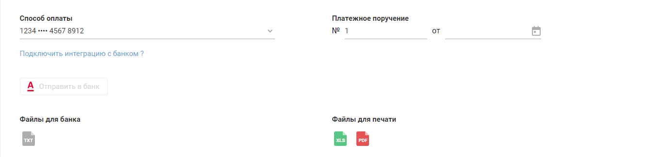 Также можно воспользоваться отправкой п/п по интеграции в банк. Операция по оплате отразится в разделе «Деньги» с номером и датой из поля «№ ... от ...». При необходимости отредактируйте дату прямо на данном шаге.