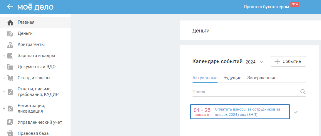 Для уплаты взносов за сотрудников в Календаре событий нажмите на событие «Оплатить взносы за сотрудников за ... года (ЕНП)»: