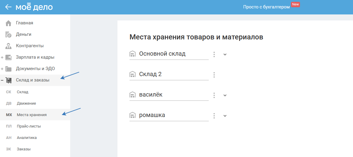 Для перехода в раздел выберите в меню «Склад и заказы — Места Хранения»: