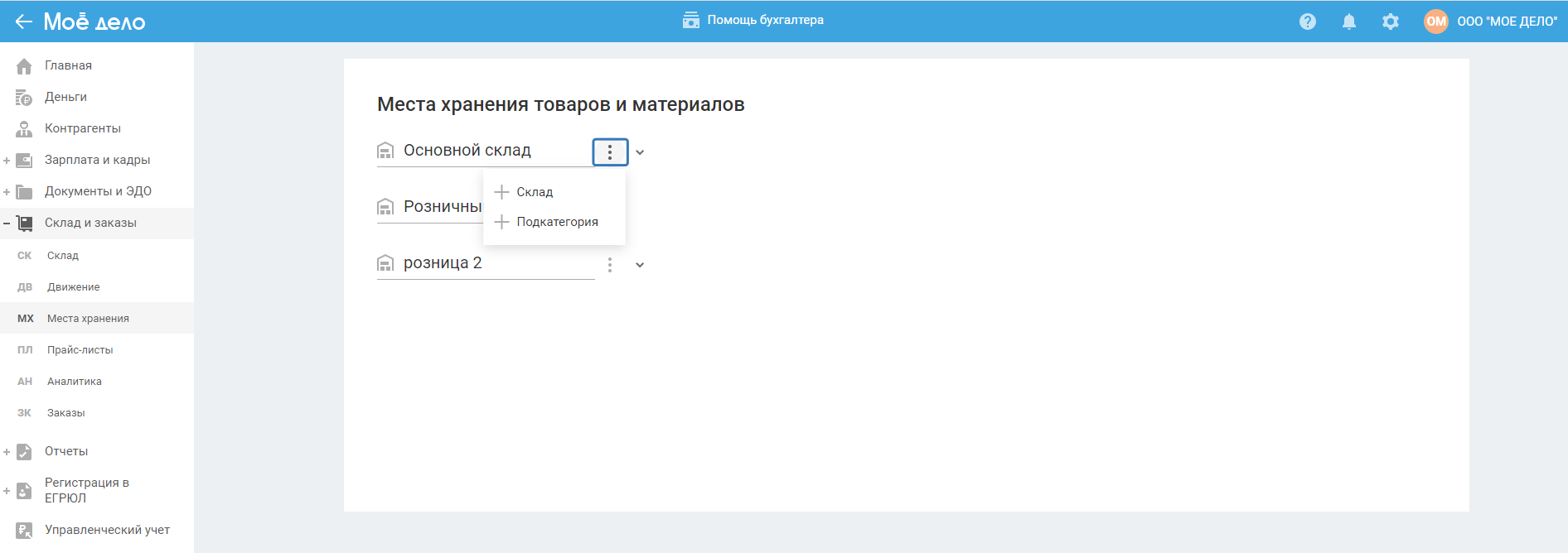 Для добавления места хранения нажмите на кнопку три точки, далее выберите «+ Склад» или «+ Подкатегория»: