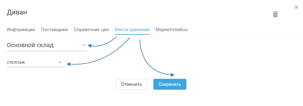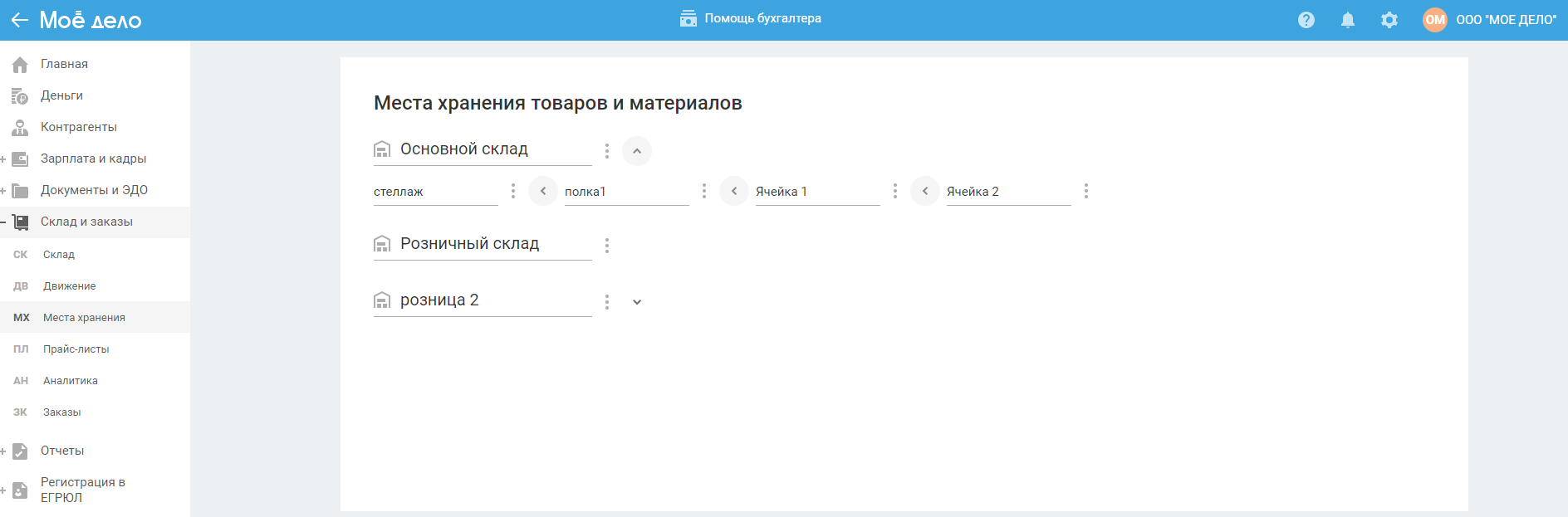 Для каждого склада вы можете добавлять места хранения. Максимальный уровень вложенности мест хранения — 4, например: Зона хранения, Стеллаж, Ряд, Ячейка. Также можете указать и меньше, например: Шкаф, Полка.
