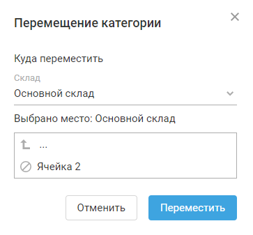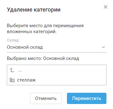 При нажатии пункта «Удалить» удаляется поле с данным элементом, а также все вложенные категории хранения. При удалении появляется возможность переместить вложенные категории в другое место хранения: