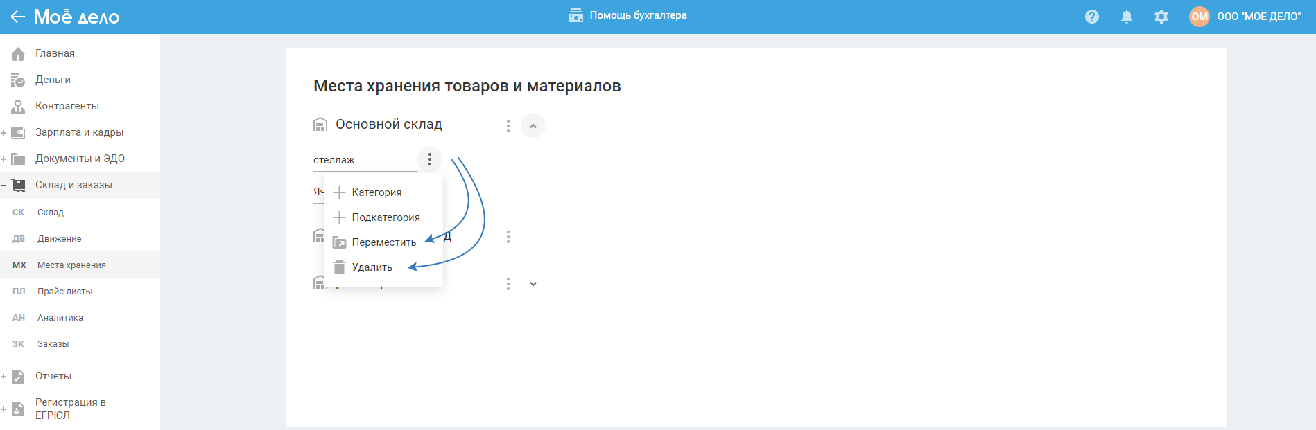 В каждой строке с местом хранения справа отображается кнопка три точки, при нажатии на которую можно отредактировать или удалить место хранения: