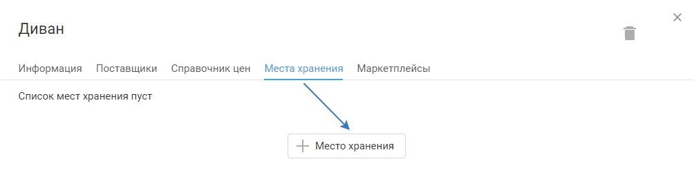 В карточке товара/материала выберите «Места хранения» и нажмите «+ Место хранения»: