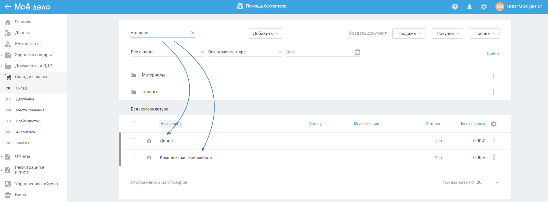 Для этого в строку поиска введите наименование места хранения, после чего в таблице «Вся номенклатура» отобразятся все товары/материалы, в которых указано данное место хранения: