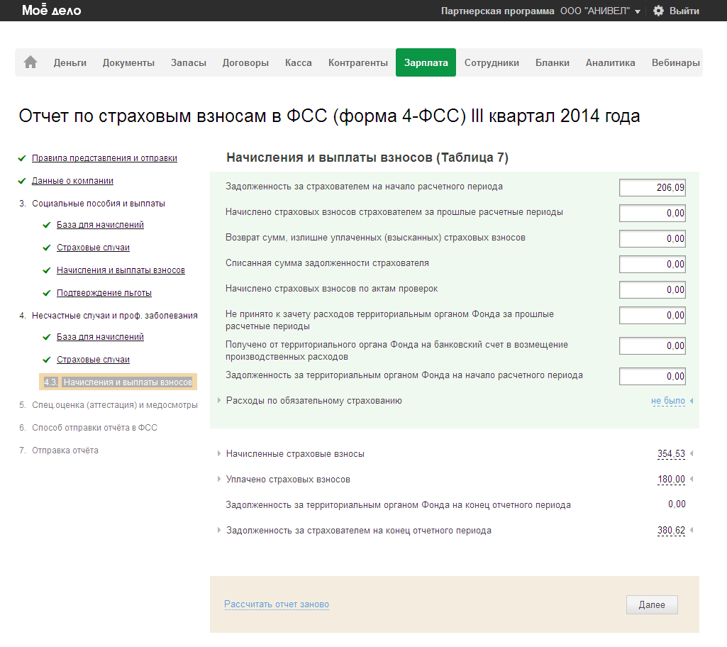 На данном шаге указываются начисленные и уплаченные взносы за сотрудников в отчетном квартале и с начала года на травматизм. Их можно наглядно просмотреть, нажав на подразделы "Начисленные страховые взносы" и "Уплачено страховых взносов". Т.е. форма заполняется нарастающим итогом с начала года независимо за какой квартал формируется отчет. Подразделы "Задолженность за территориальным органом Фонда на конец отчетного периода" и "Задолженность за страхователем на конец отчетного периода" заполняются на основании данных, которые отражены в сервисе, во вкладке Зарплата. Сравнить данные вы можете во вкладке Зарплата-Расчёт и Взносы, переключая на нужный месяц сверху в левом углу. Уплаченные взносы Вы можете просмотреть во вкладке Деньги, воспользовавшись "Подробным фильтром"-"Бюджетный платеж".