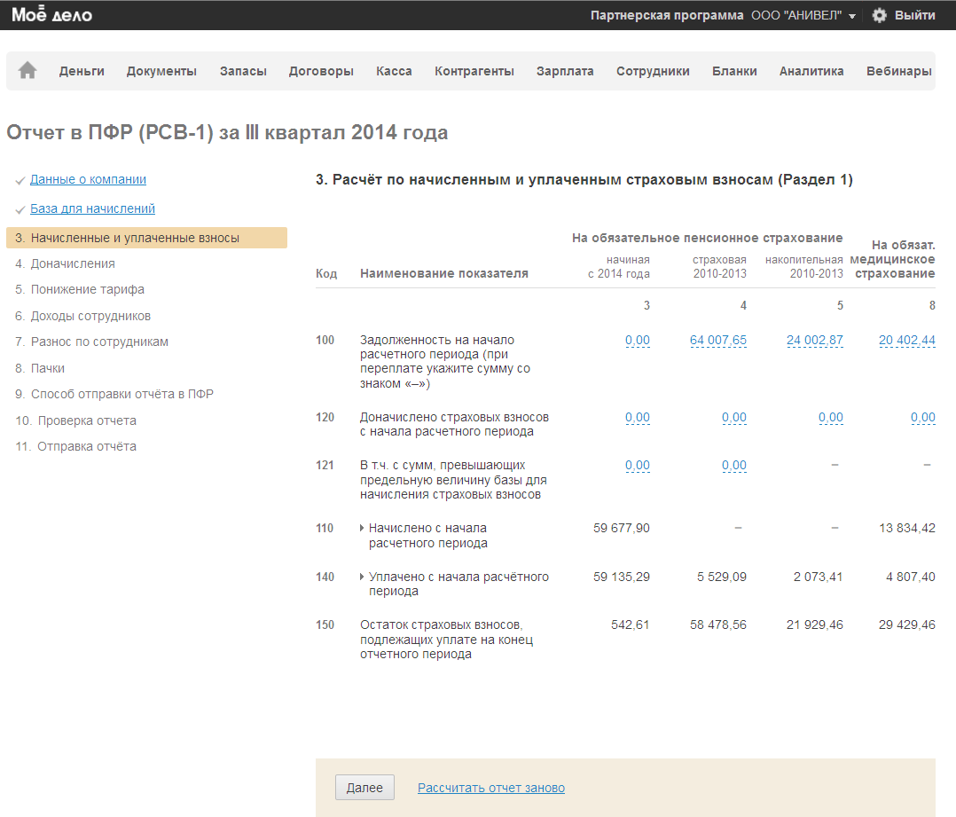 Внимание! В этом шаге изменения вручную не вносите. Раздел заполняется на основании информации отраженной во вкладках Зарплата и Деньги. При необходимости изменить данные по начисленным взносам, правки следует внести во вкладке Сотрудники у конкретного работника. Внести изменения в платежи за отчетный квартал вы можете во вкладке Деньги.