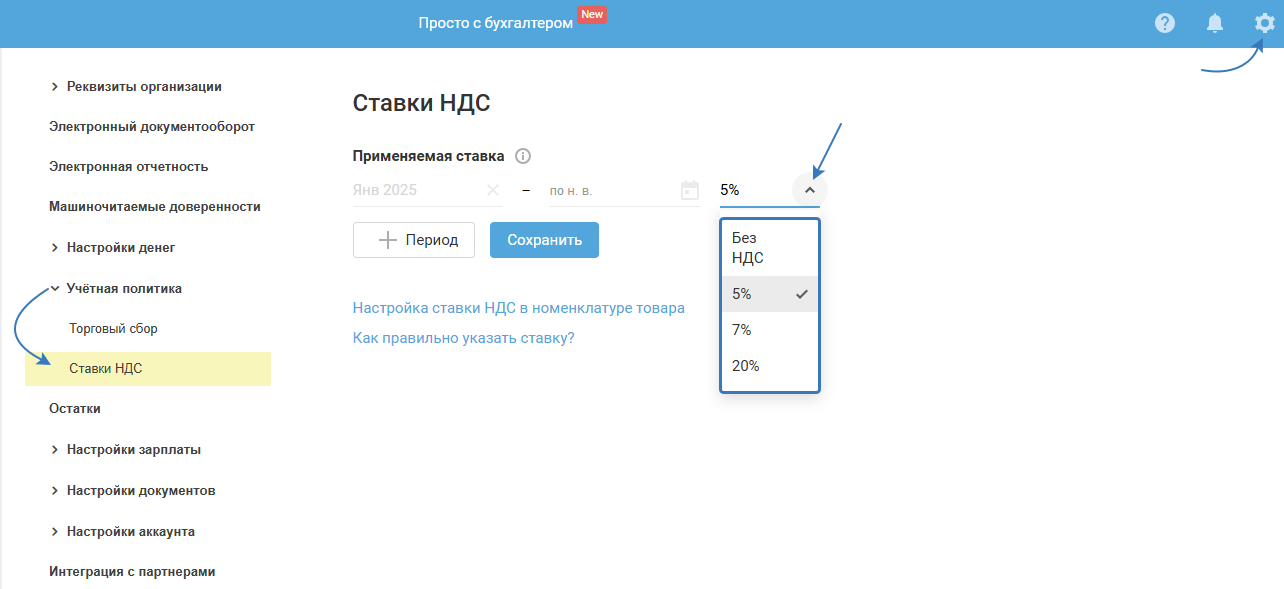 Если в этом периоде данных в Учётной политики нет, то по умолчанию будет включенный тумблер НДС и ставка «Без НДС».