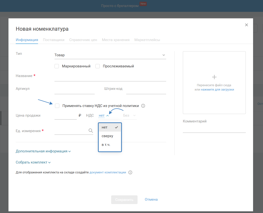Если в карте товара настройка «Применять ставку НДС из учётной политики» отключена, то поле выбора ставки НДС становится активным. По умолчанию указано «Без НДС». Вы выбираете нужную ставку: