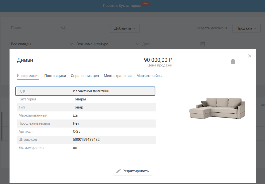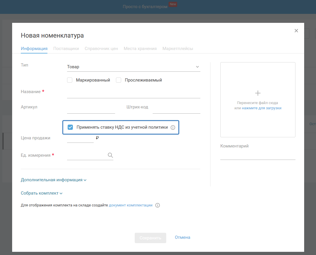После сохранения карточки товара с включенной настройкой «Применять ставку НДС из учётной политики» в строке НДС будет указано «Из учётной политики»: