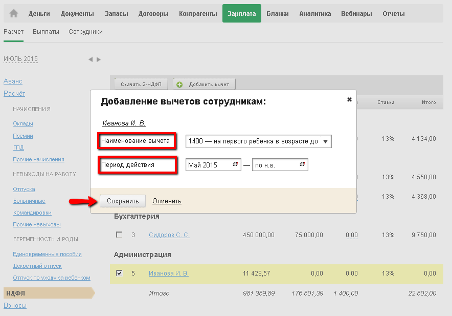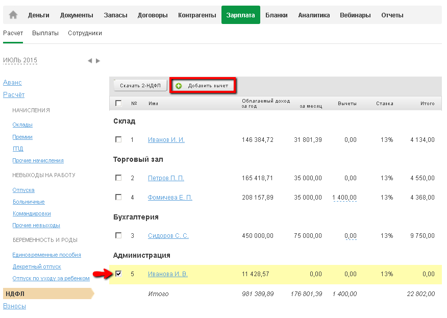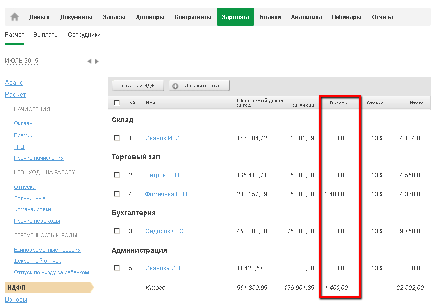 По данной графе собирается информация по имеющимся у сотрудников вычетам. То есть если ранее был отражен вычет, то по данной графе будет указана его сумма. Если вычеты не добавлены, то поданной графе будет указан "0".