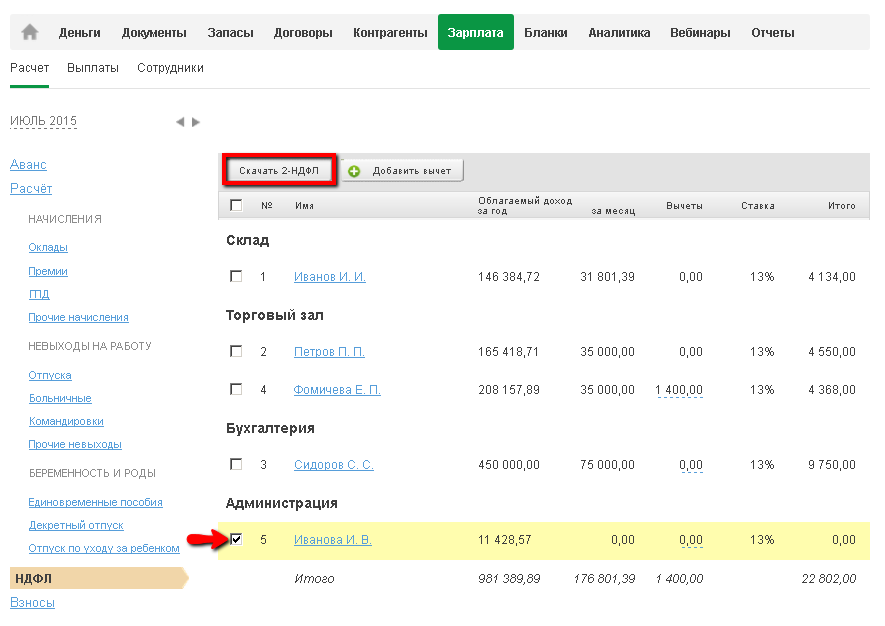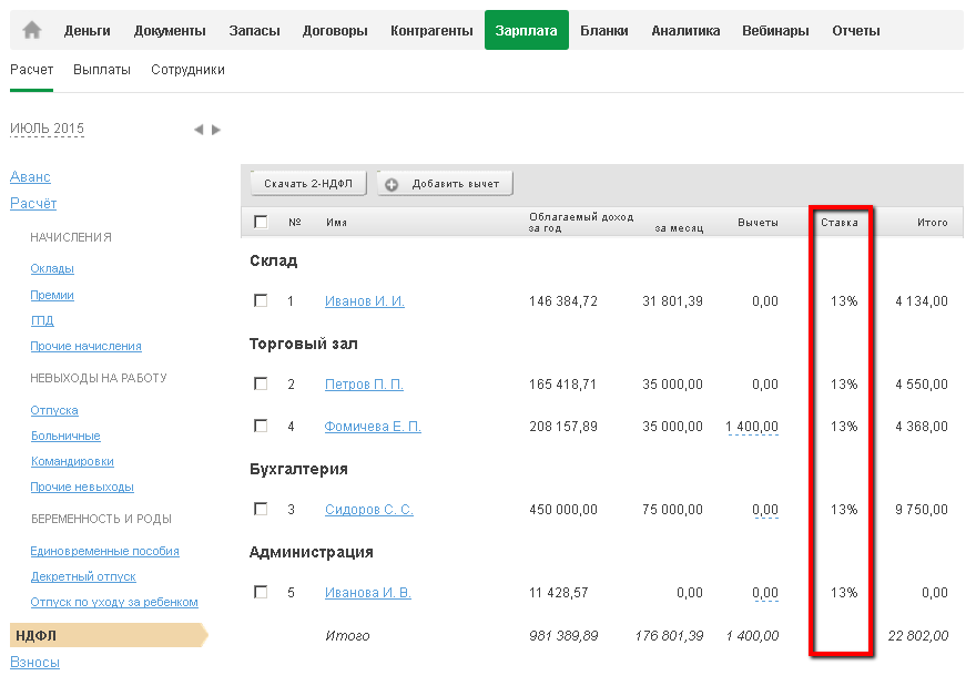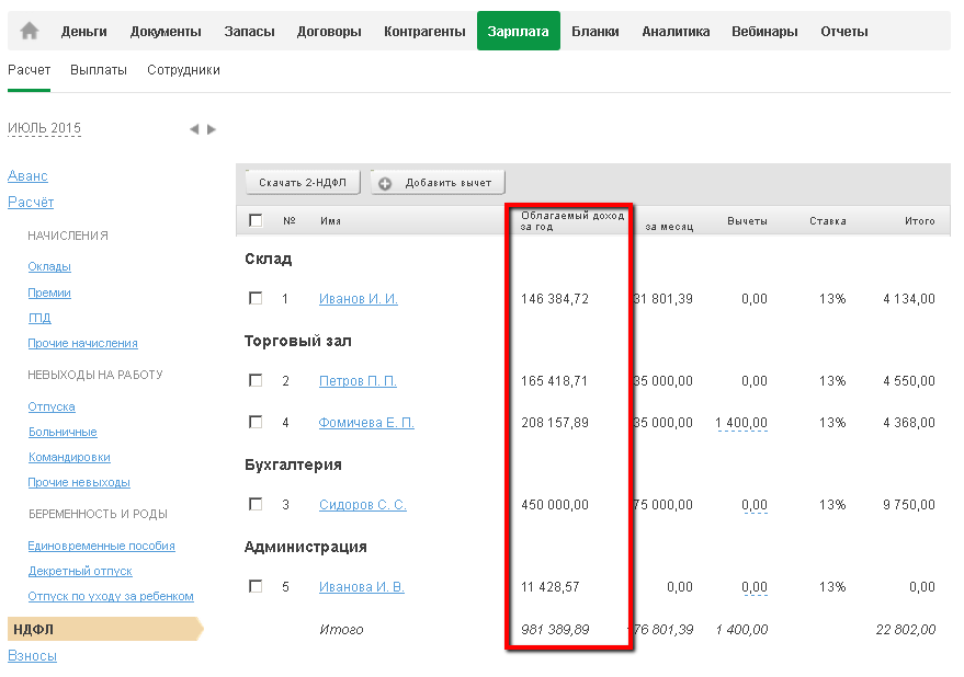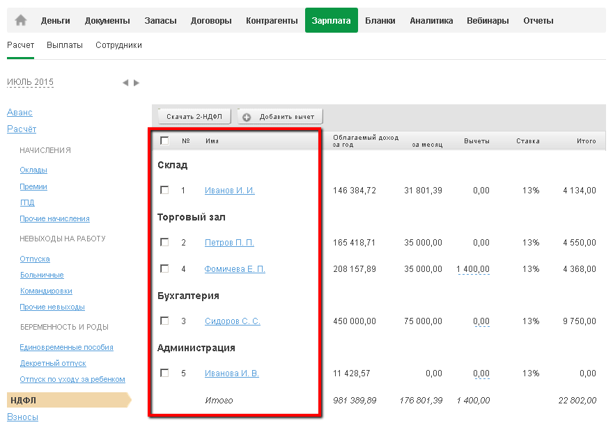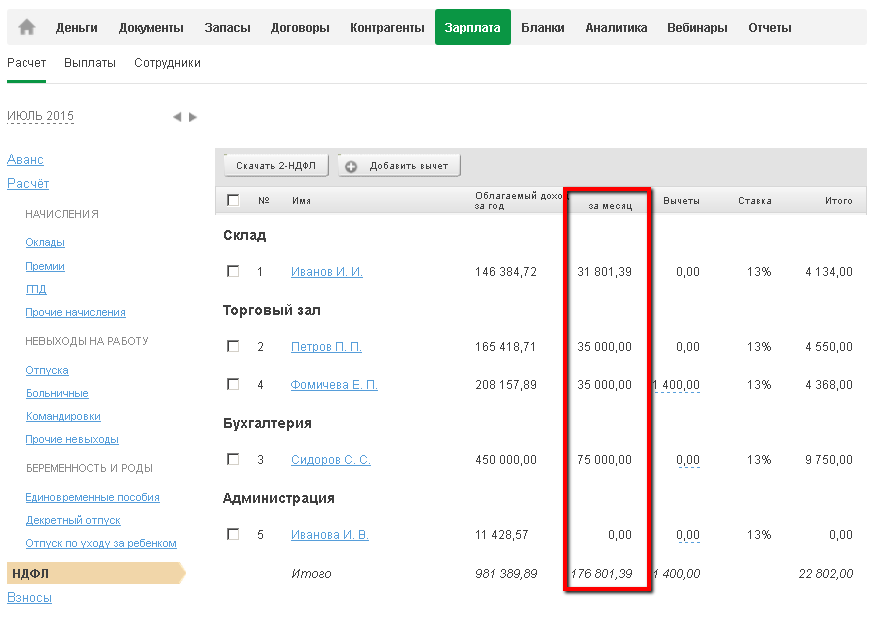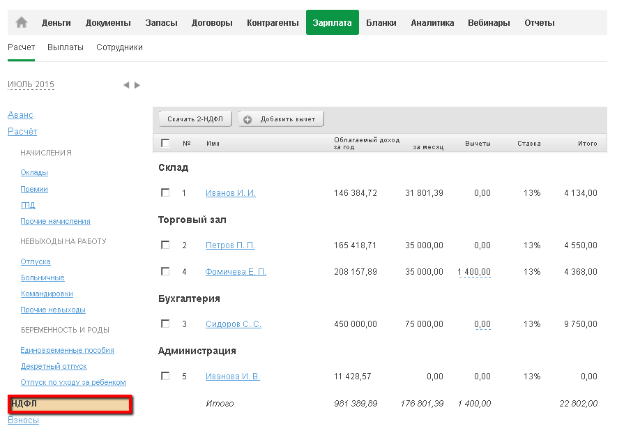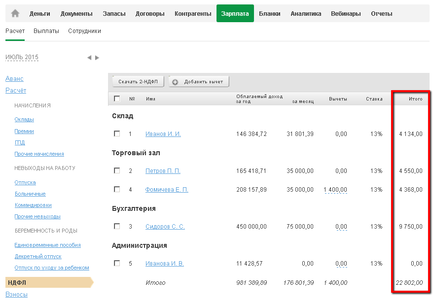 Данные этого раздела формируются исходя из отраженных Вами начислений по предыдущим подразделам вкладки Зарплата или в настройках сотрудников.