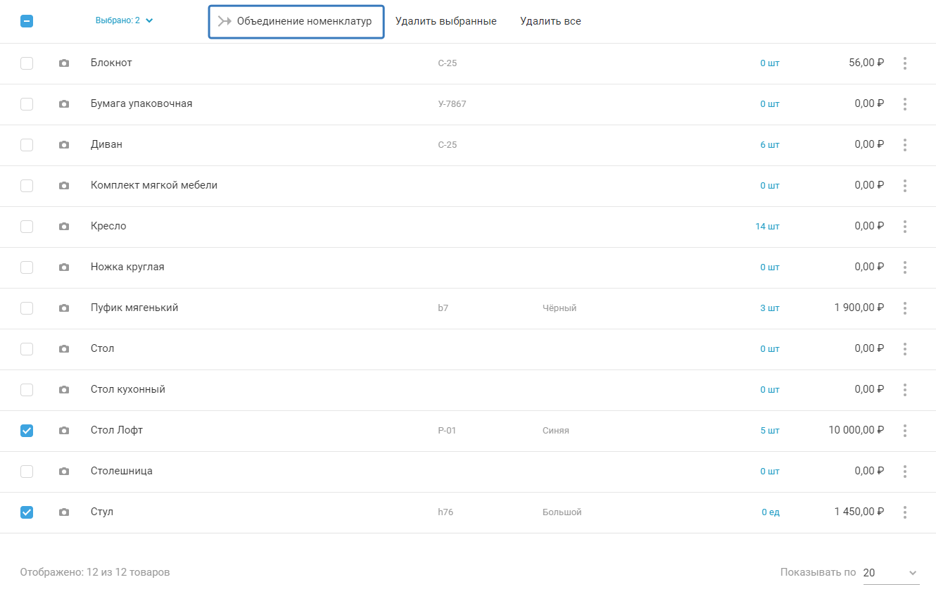 2. Выберите 2 и более номенклатуры с нужным типом (к чему относится номенклатура, товару или комплекту, можно посмотреть в карте товара), для этого поставьте галки в графе слева от наименования, после чего нажмите на кнопку «Объединение номенклатур»:
