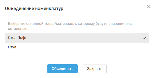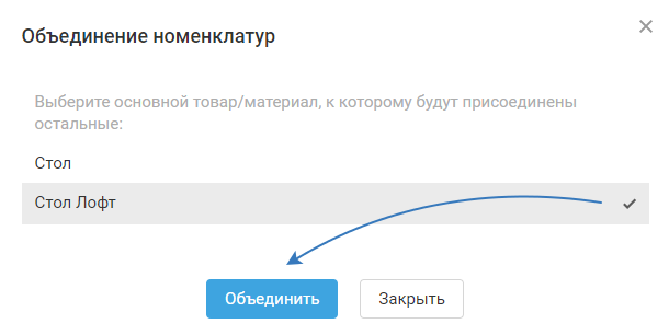 3. Выберите основную номенклатуру (это наименование будет отображаться в сервисе после объединения):