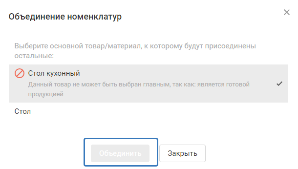 4. Если объединение номенклатур не может быть завершено, тогда кнопка «Объединить» будет неактивна.