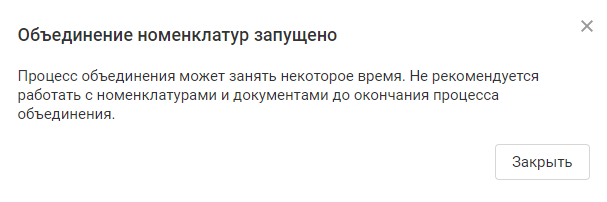 6. Процесс объединения может занять некоторое время. Не рекомендуется работать с номенклатурами и документами до окончания процесса объединения: