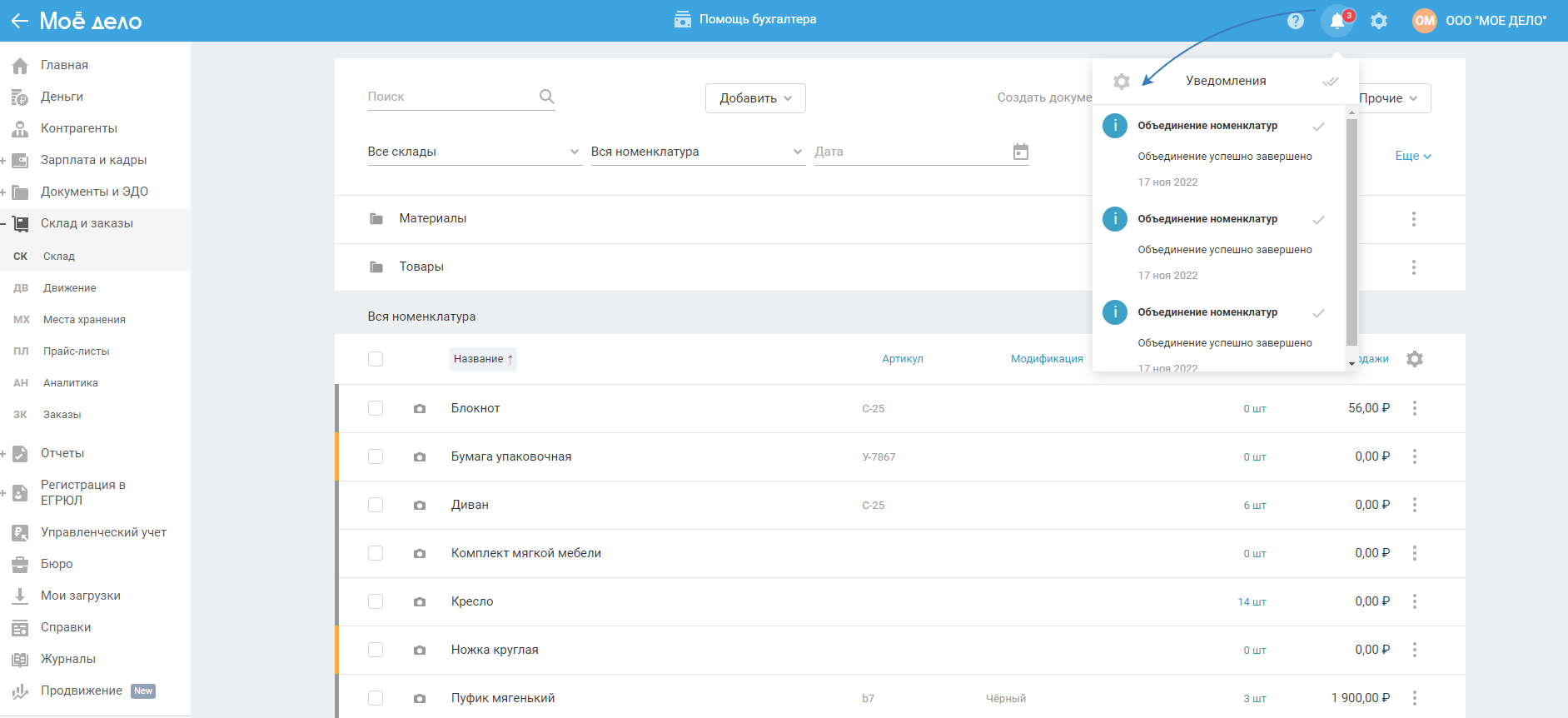 8. В результате объединения номенклатур пересчитаются остатки на складе: