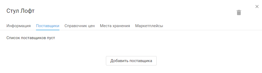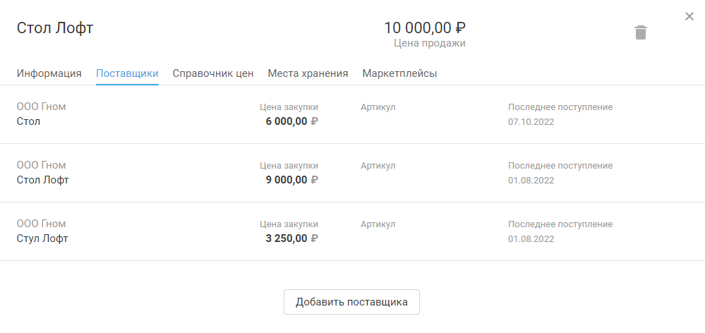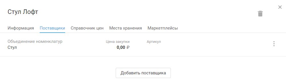 Вкладка «Поставщики» будет содержать данные об этом контрагенте и присоединённой позиции: