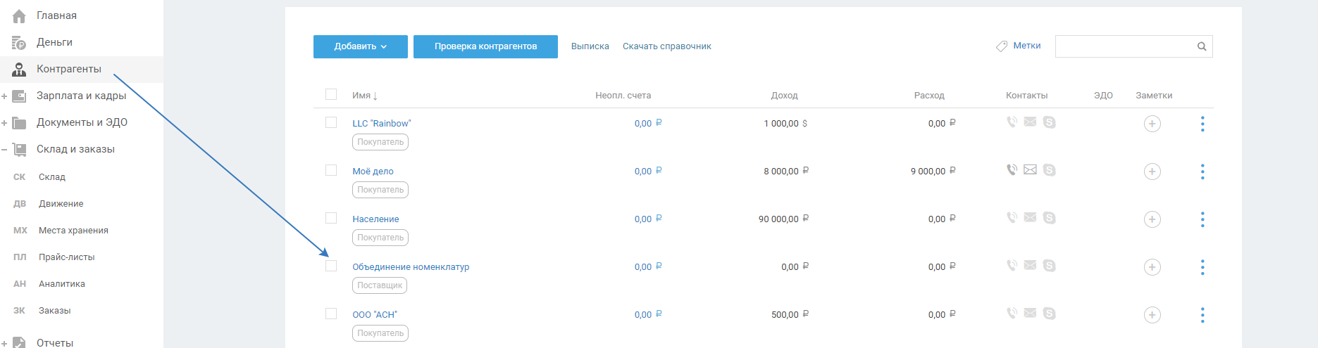 После объединения номенклатур будет создан контрагент «Объединение номенклатур»: