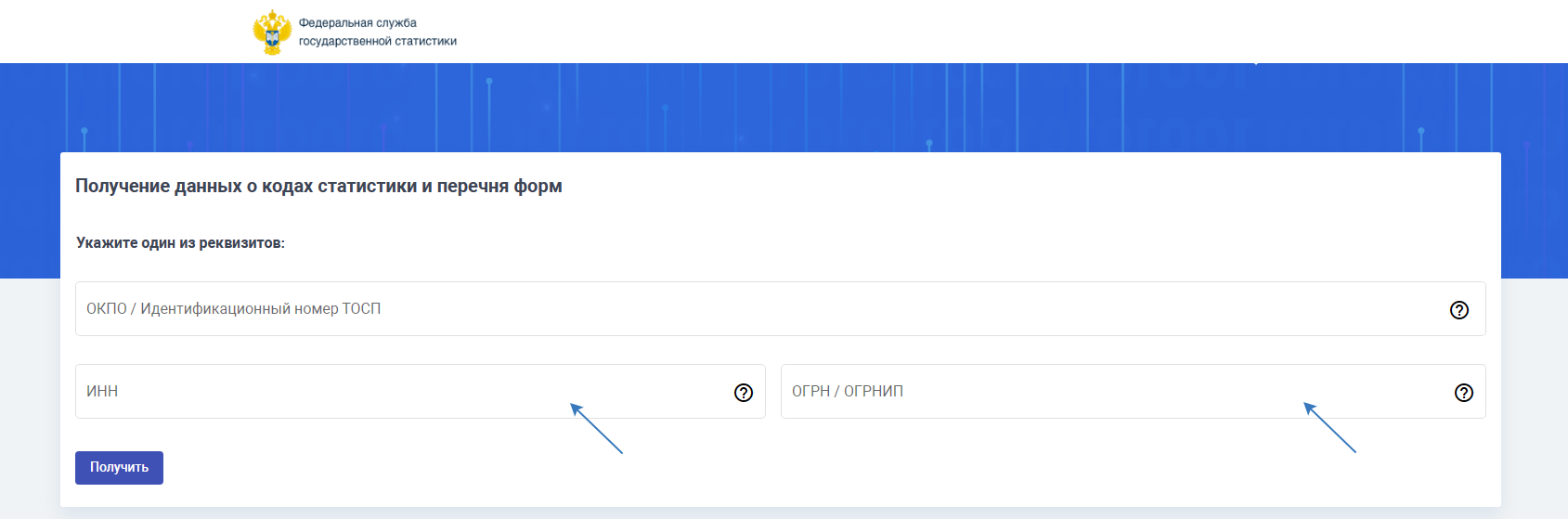 ОКПО в некоторых регионах можно определить также с помощью сервисов территориальных отделений Росстата. Перейдите на сайт ФСГС, внесите ИНН/ОГРН/ОГРНИП, нажмите «Получить»: