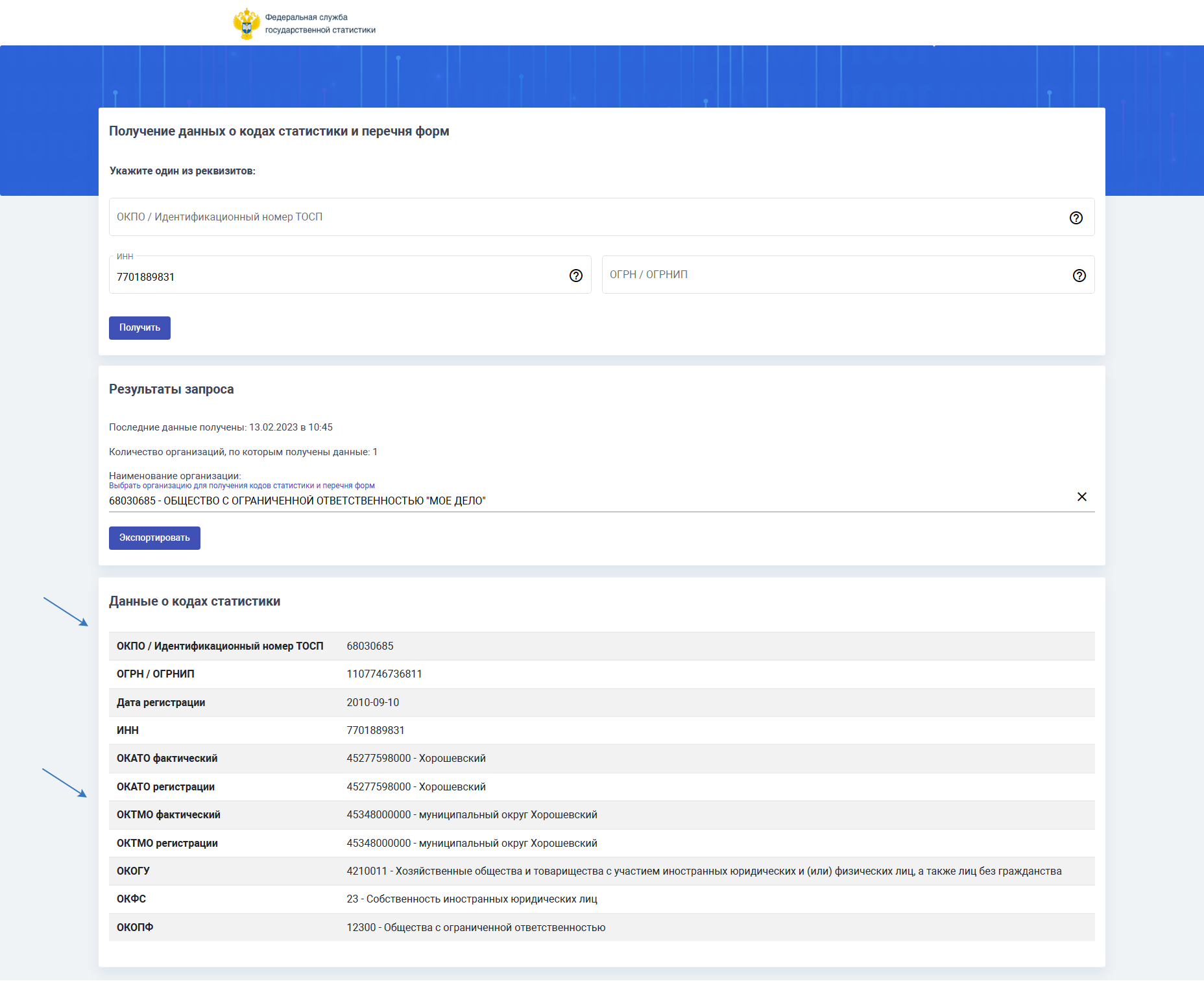 Чтобы узнать ОКТМО** и ОКПО*, воспользуйтесь сервисом на официальном сайте Росстата.
