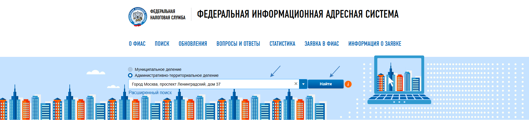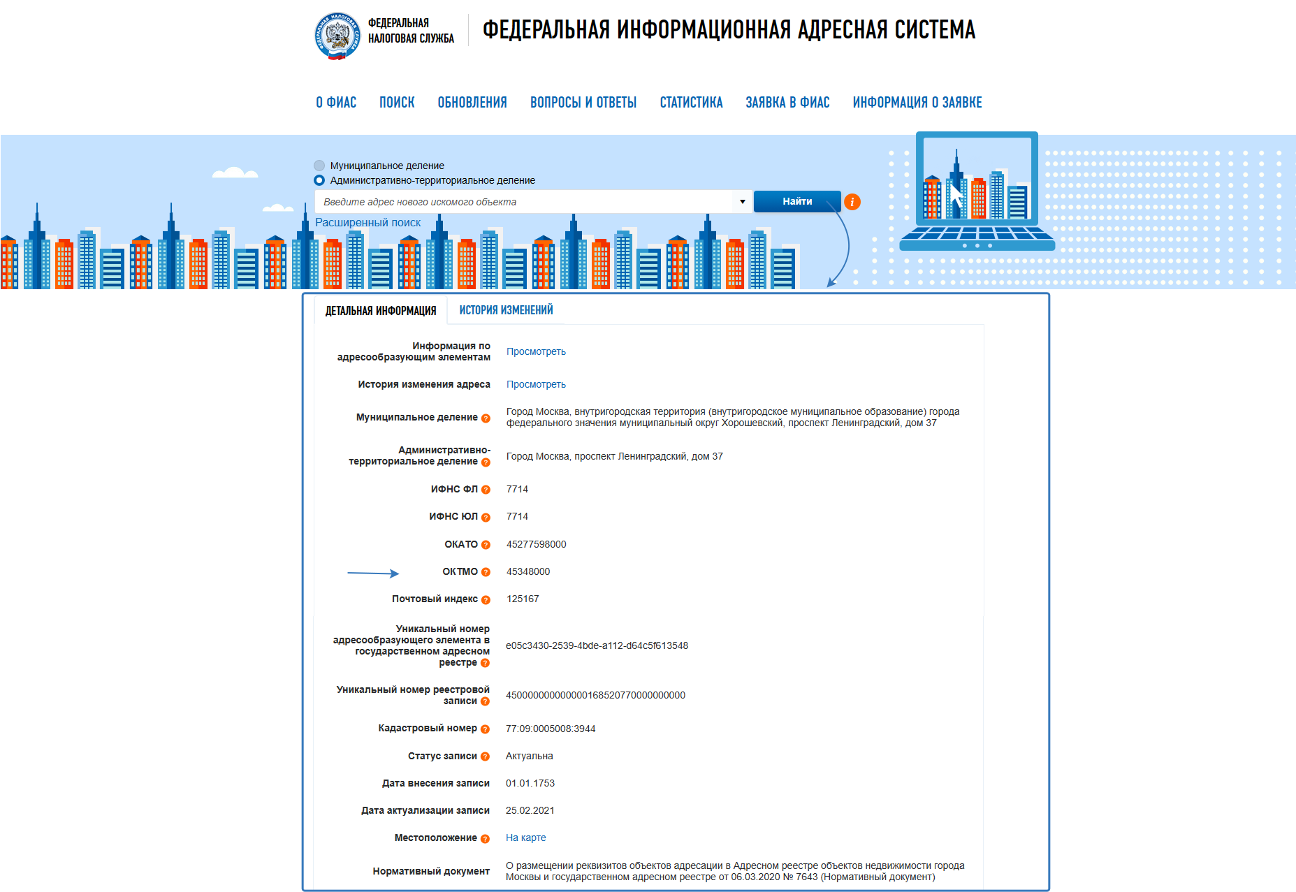 ОКТМО также можно определить с помощью сервиса на официальном сайте ФНС или с помощью ГАР (Государственный адресный реестр). Внесите адрес места жительства или места нахождения объекта налогообложения и нажмите кнопку «Найти»: