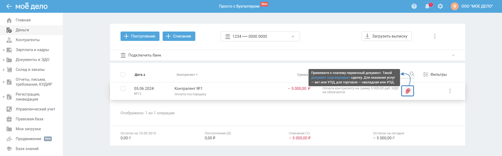 После загрузки/сохранения операции в разделе «Деньги» будет отображаться значок скрепки: