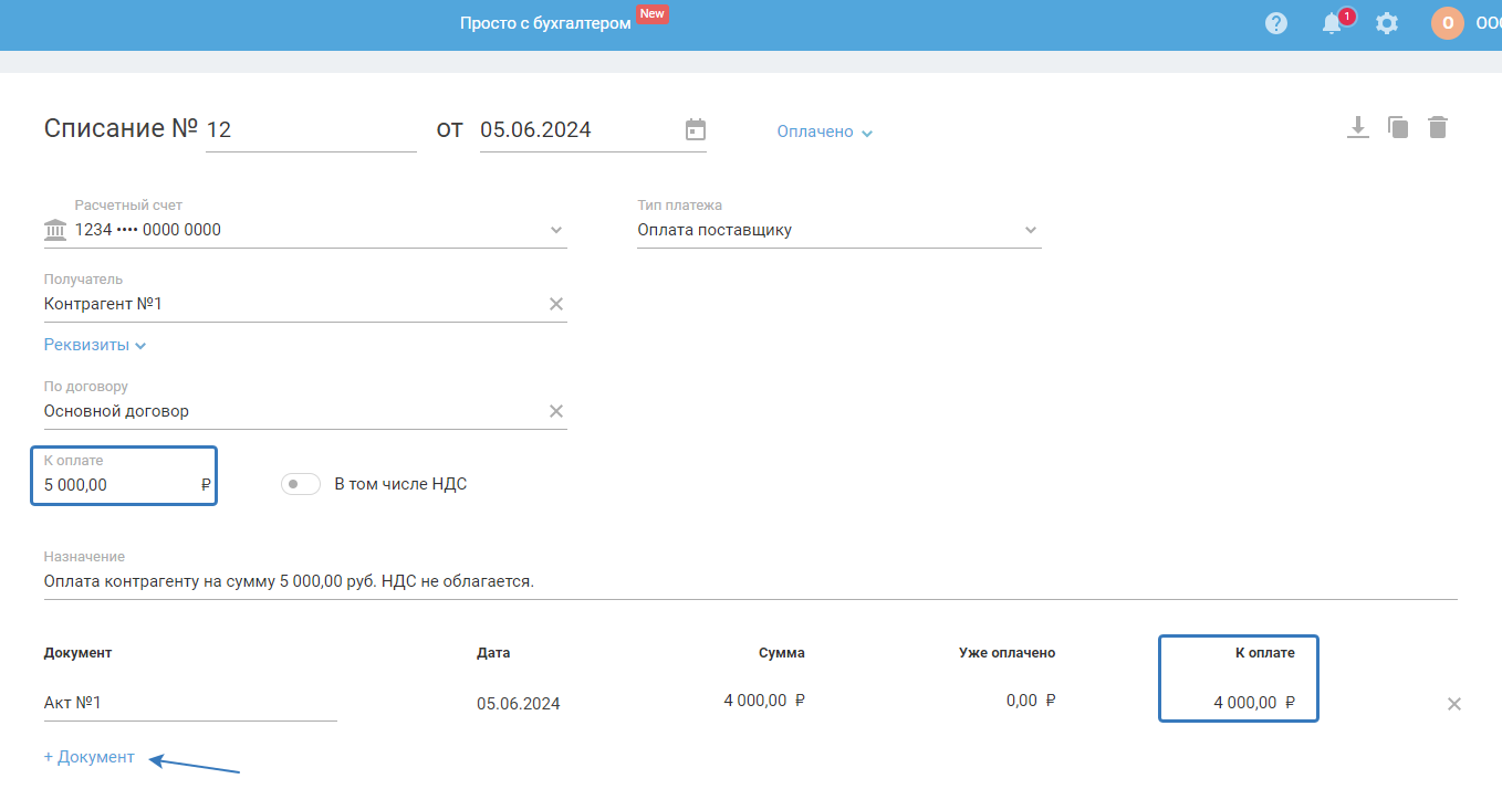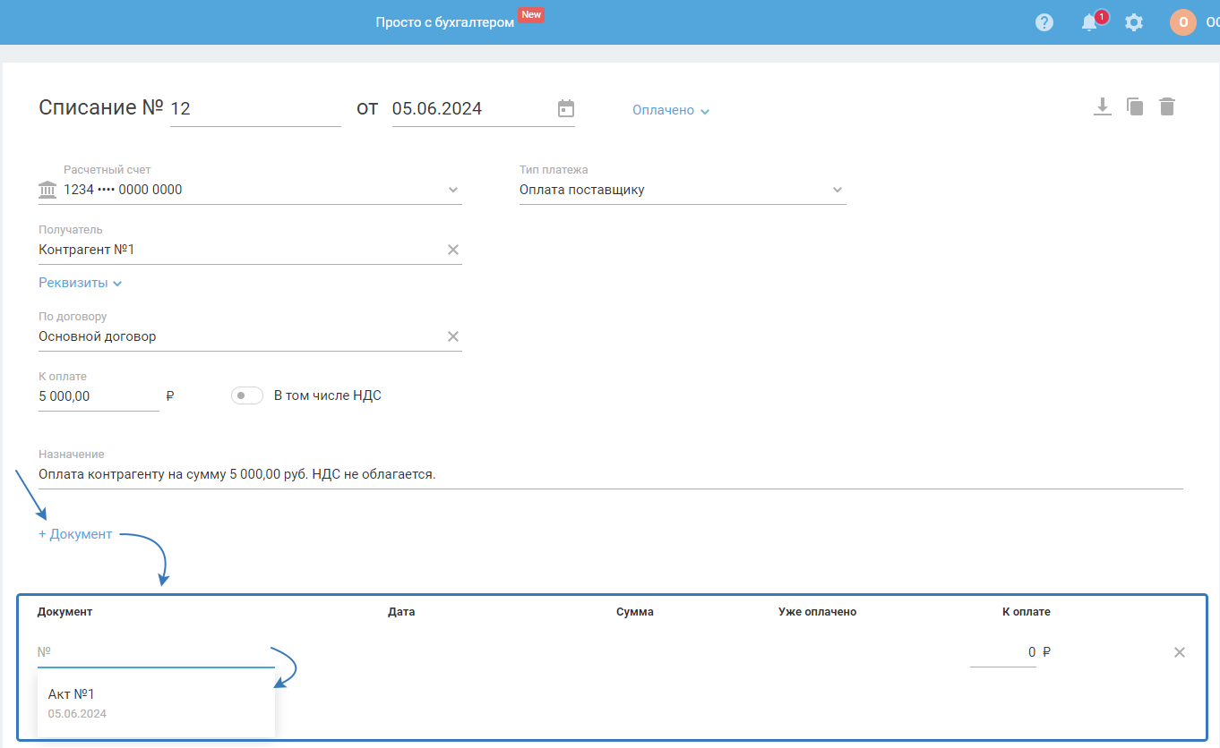 – Поле «+ документ». Представляет собой функционал связанных документов. При нём целесообразно привязать документы поставщика, которые оплачиваются данным документом (при условии, что такие документы уже заведены в сервисе). Например, если ранее контрагент представил пользователю накладную по отгруженному товару, при добавлении документа в выпадающем списке появится список документов, неоплаченных ранее. Если выдается аванс, данное поле заполнять не нужно.