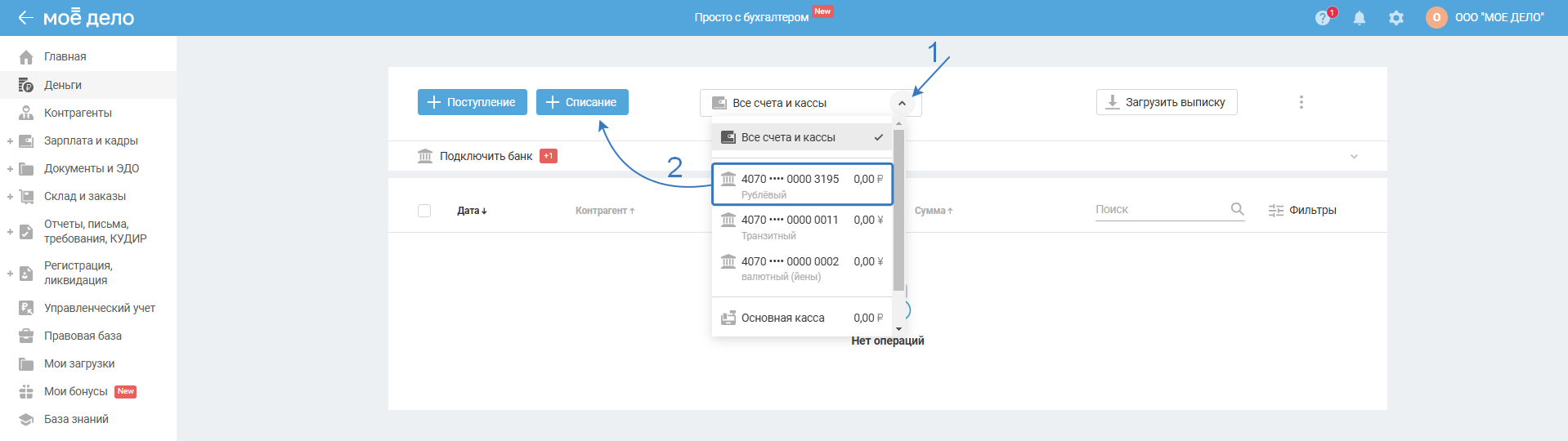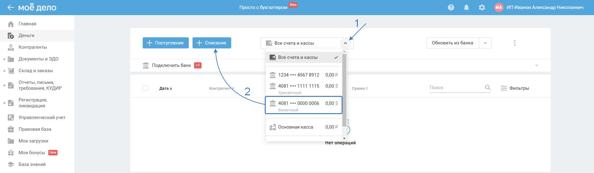 В разделе «Деньги» нажмите на поле «Все счета и кассы» и выберите из выпадающего списка расчётный валютный счёт, с которого происходит списание денежных средств.