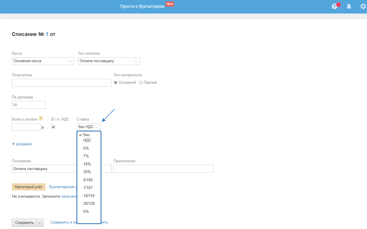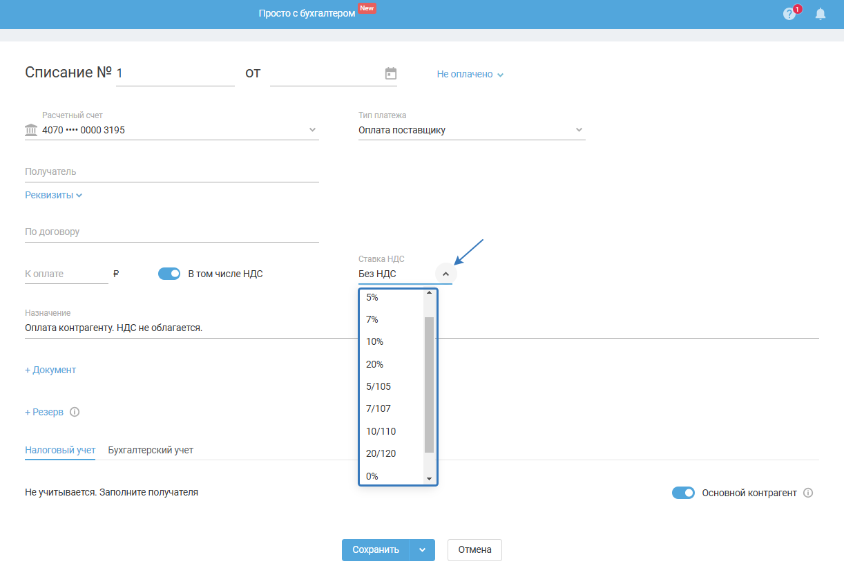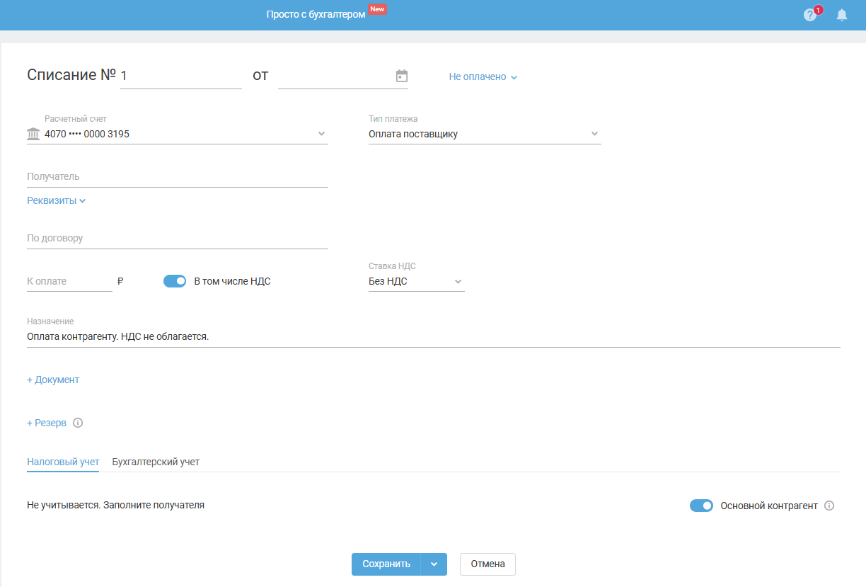 – Тип платежа. «Оплата поставщику» (стоит по умолчанию).