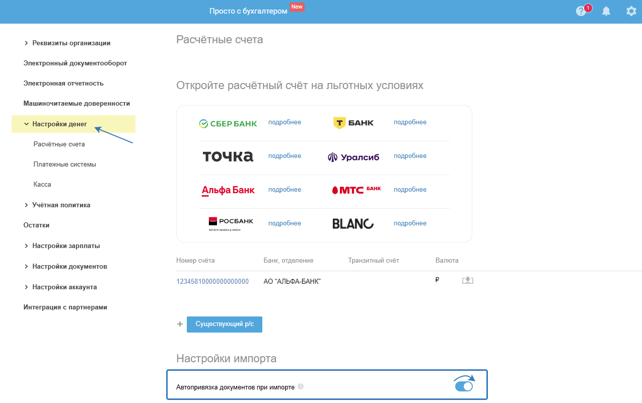 Для автоматизации работы вы можете настроить привязку загружаемых операций из банковской выписки к ранее созданным подтверждающим документам (актам, накладным, УПД), для этого включите функцию «Автопривязка документов при импорте»: