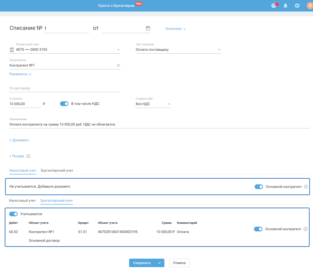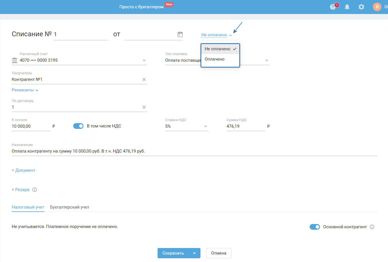 – Тип контрагента. По умолчанию всегда указывается «Основной контрагент» (счёт 60.02), данный счёт предполагает расчёты с основными поставщиками. Однако в некоторых случаях может использоваться счёт 76.05, например, если деньги перечисляются разовым контрагентам, тогда переведите переключатель в строке «Основной контрагент» в левое положение.