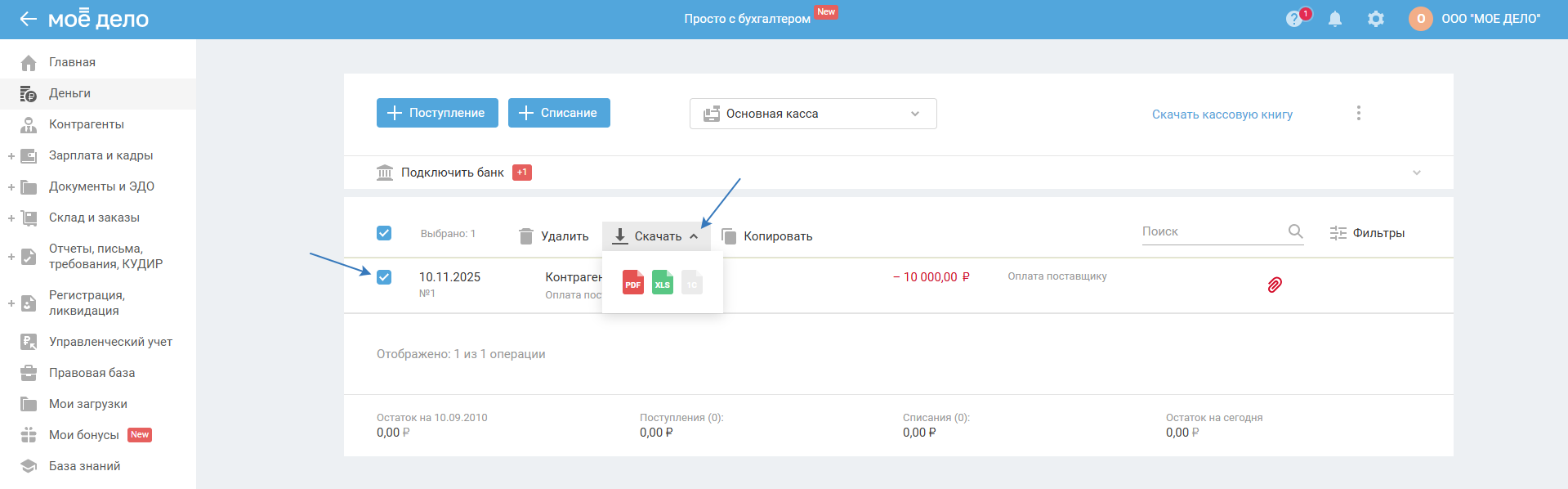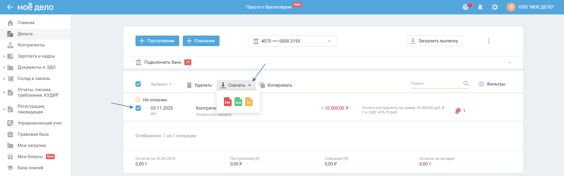 Для скачивания документов в таблице документов раздела «Деньги» выберите галочкой соответствующее списание и нажмите «Скачать»: