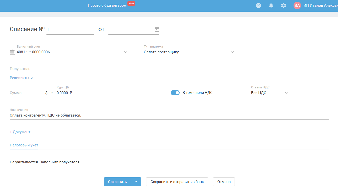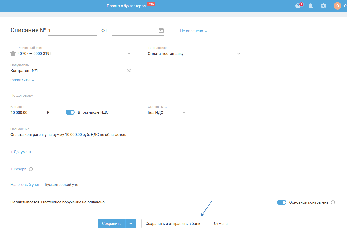 Если же подключена интеграция с банком-партнёром, то созданное платёжное поручение можно сразу отправить в интернет-банк (без скачивания). В этом случае в нижней части страницы списания появляется кнопка «Сохранить и отправить в банк»: