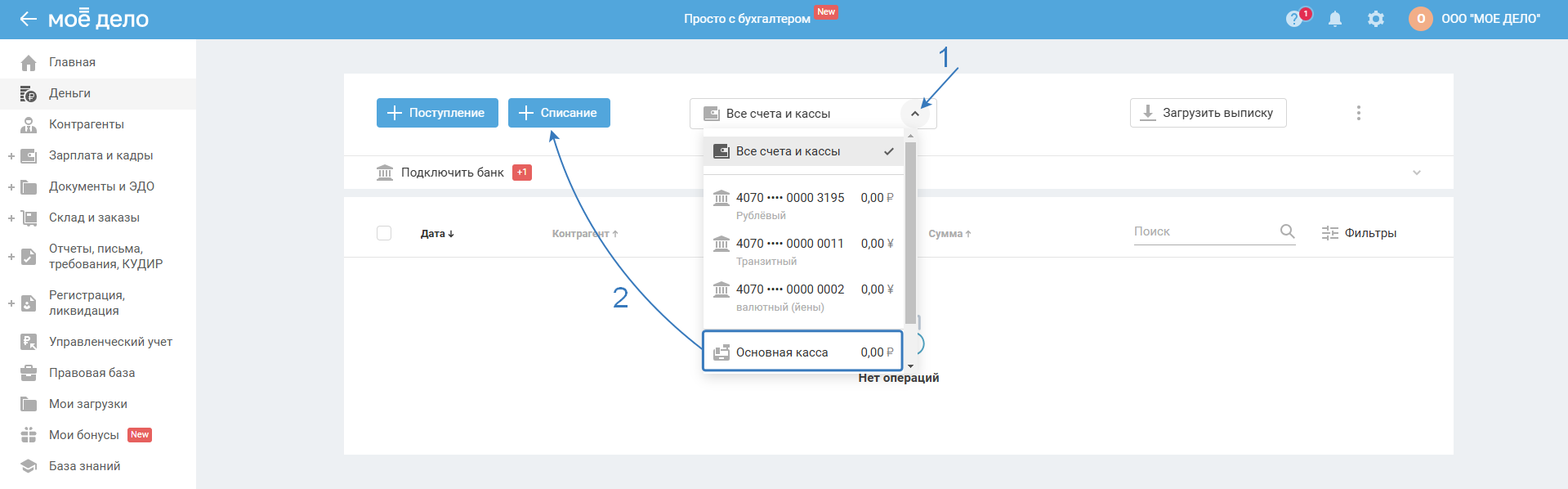 В разделе «Деньги» нажмите «Все счета и кассы» и выберите одну из касс (по умолчанию используется «Основная касса»), созданных в разделе «Реквизиты»: