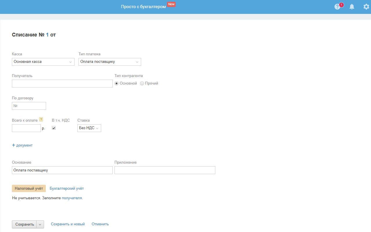 – Получатель. Нужно выбрать поставщика, которому перечисляются денежные средства. Если его нет в списке, нового контрагента можно создать тут же, кликнув в выпадающем списке «+ Контрагент».