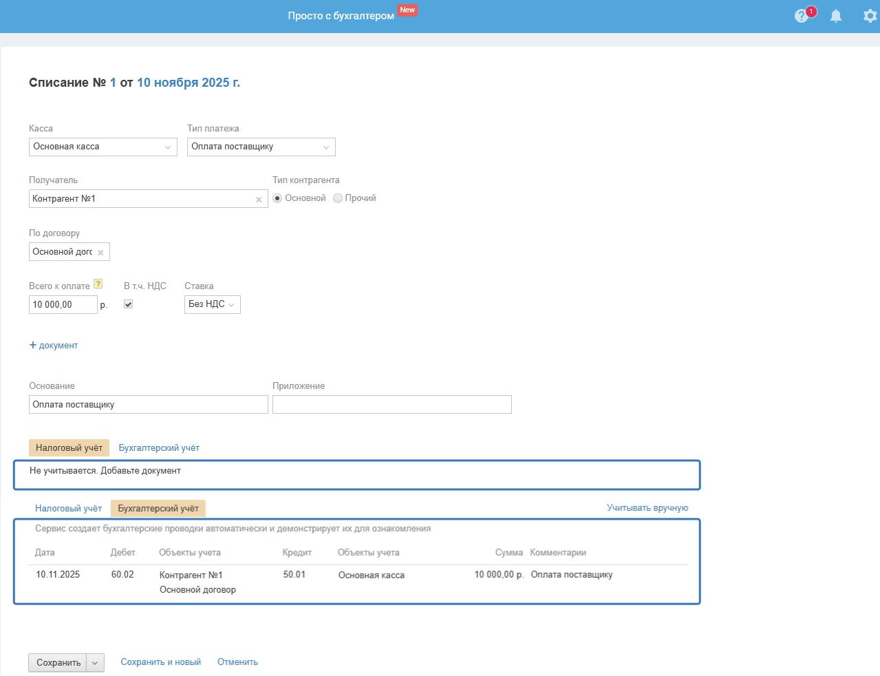 – Получатель. Нужно выбрать поставщика, которому выдаются денежные средства. Если его нет в списке, нового контрагента можно создать тут же, кликнув в выпадающем списке «+ Контрагент».