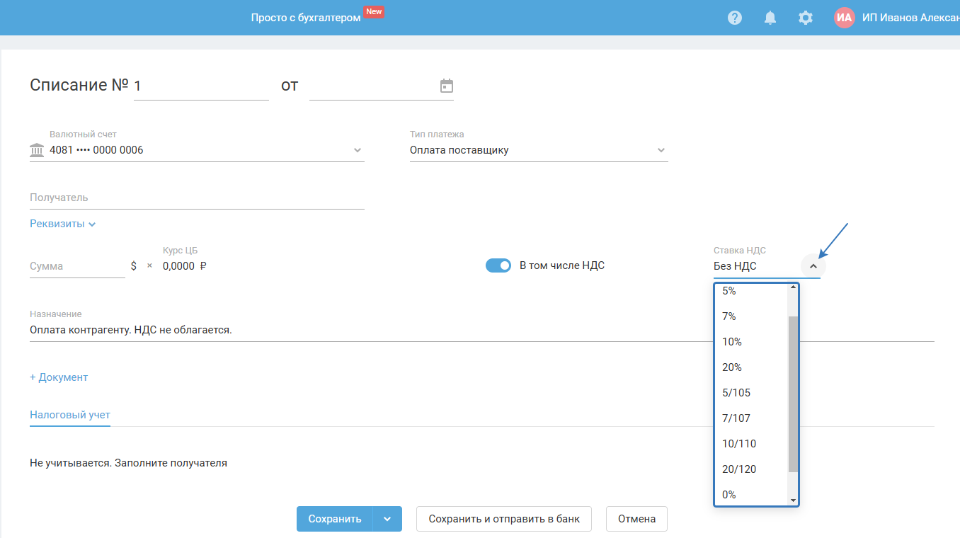 – В том числе НДС. Если в составе суммы перечисляется в т.ч. НДС, необходимо указать это в соответствующем поле.