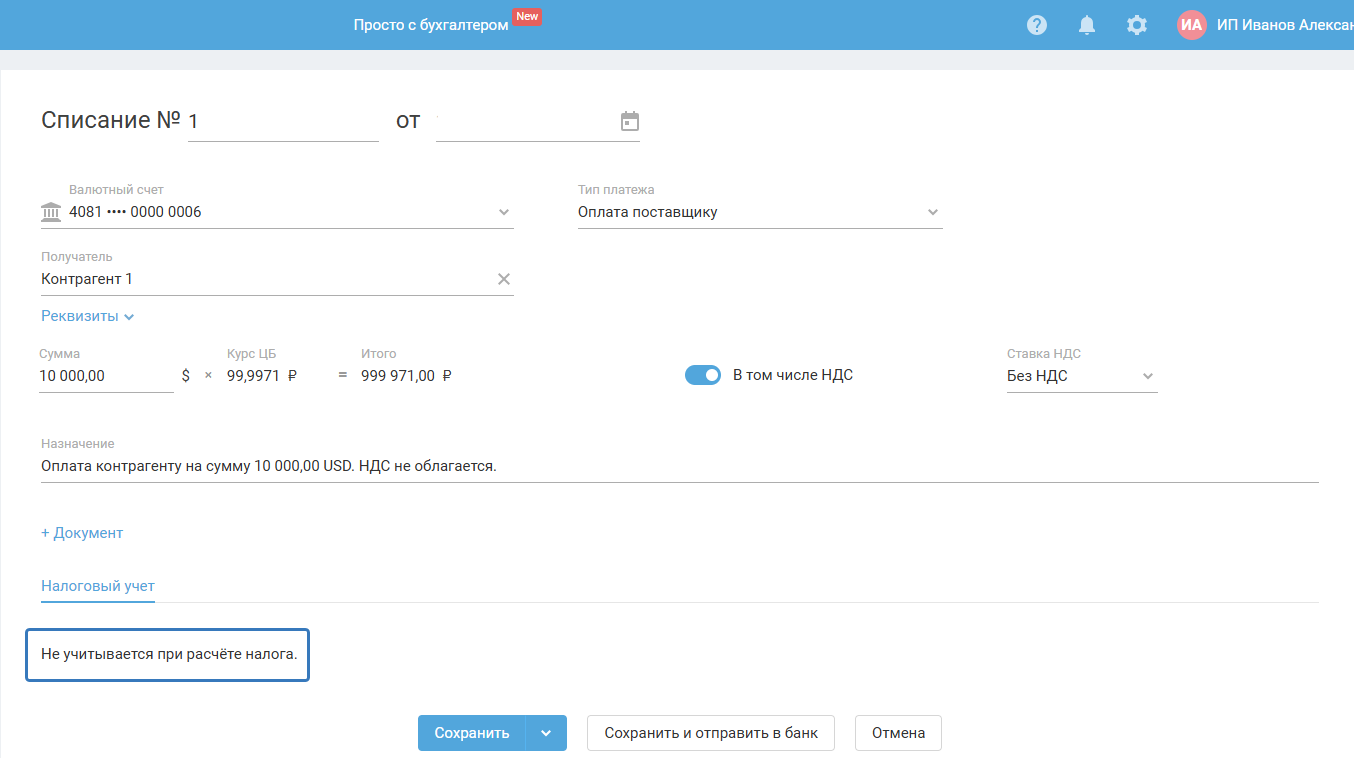 – Сумма. Укажите сумму оплачиваемых денежных средств в иностранной валюте. Сервис автоматически перерасчитает полученную сумму в рубли по курсу ЦБ РФ, установленному на дату формирования списания.