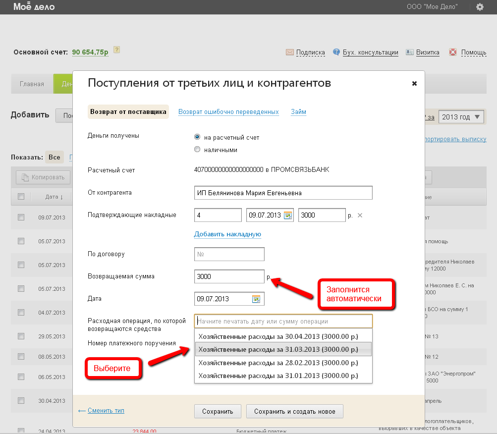 В строке «Возвращаемая сумма» укажите сумму возврата. Обратите внимание на то, что данная строка связана со строкой «Расходная операция, по которой возвращаются средства», в которой вы можете указать ранее добавленный ошибочный расход (его дату или сумму), выбрать нужное из выпадающего списка. Тогда возвращаемая сумма заполнится автоматически на ранее ошибочно списанную сумму.