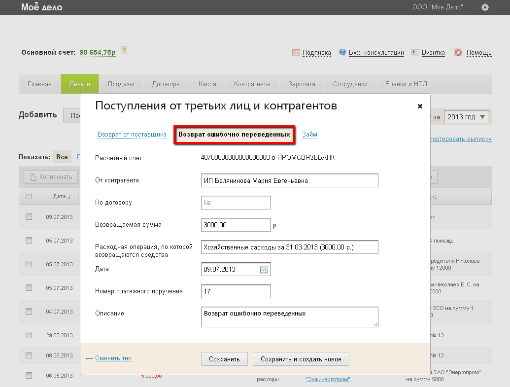 Если вы вносите подряд несколько операций данного типа, тогда нажмите кнопку «Сохранить и создать новое». Автоматически после сохранения операции откроется окно создания новой операции с типом «Возврат ошибочно переведенных». Это ускорит процесс ручного заполнения раздела «Деньги».