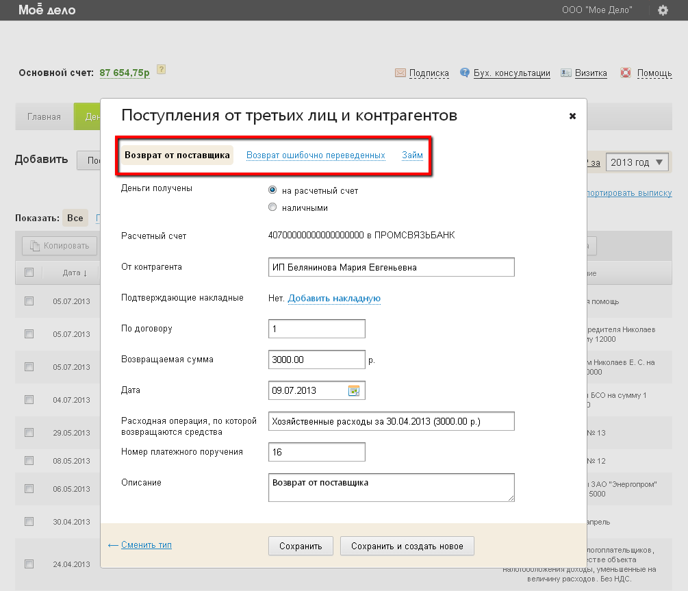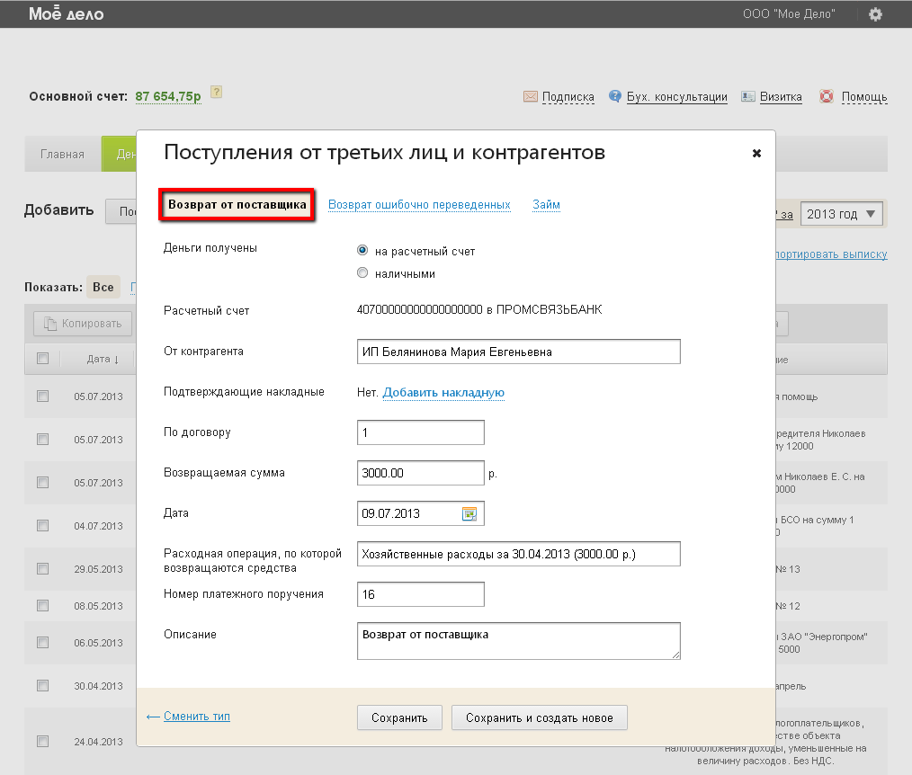 Если вы вносите подряд несколько операций данного типа, тогда нажмите кнопку «Сохранить и создать новое». Автоматически после сохранения операции откроется окно создания новой операции с типом «Возврат от поставщика». Это ускорит процесс ручного заполнения раздела «Деньги».