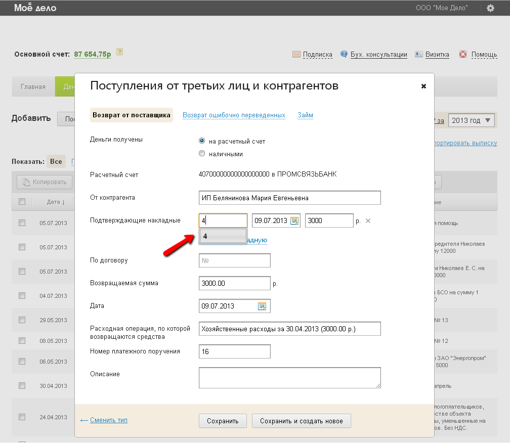 -на расчетный счет - если поставщик вернул денежные средства на р/сч ИП/организации, в строке «Расчетный счет» вы видите номер р/сч, который добавлен в разделе Реквизиты→Расчетные счета как основной р/сч. Если вы добавили несколько р/сч, то выберите нужный из выпадающего списка.