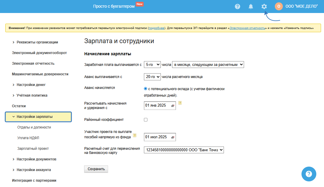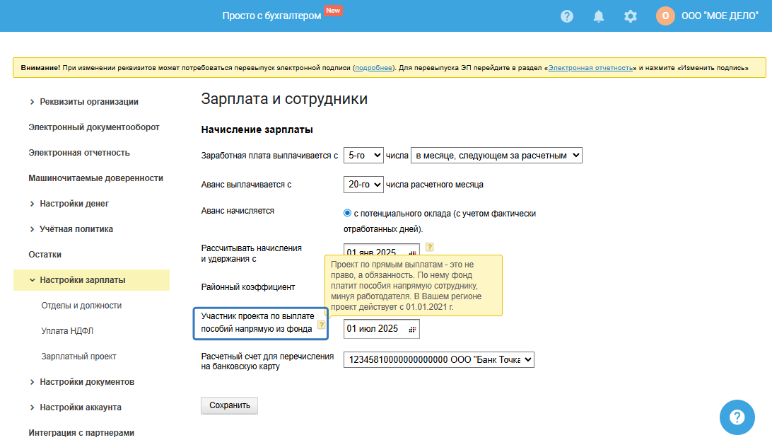 После заполнения реквизитов по юридическому адресу по шестерёнке в разделе «Зарплата» сервис автоматически ставит дату напротив поля «Участник проекта по выплате пособий напрямую из фонда», с которой в вашем регионе действует данный проект.