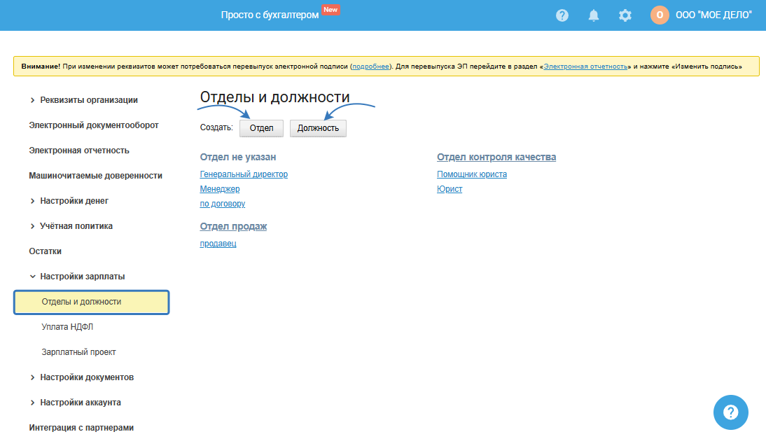 В данном разделе вы можете добавить и отредактировать отделы организации, должности. Распределить должности по отделам:
