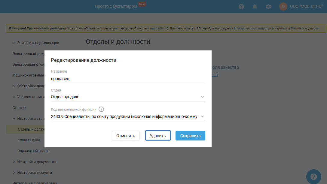 Для того чтобы удалить отдел или должность, нажмите на кнопку «Удалить»: